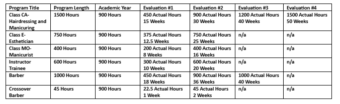 The qualitative element used to determine academic progress is a reasonable system of grades as determined by assigned academic learning. Students are assigned academic learning and a minimum number of practical experiences. Academic learning is evaluated after each unit of study. Practical assignments are evaluated as completed and counted toward course completion only when rated as satisfactory (85%) or better (the computer system will reflect completion of the practical assignment on a 100% scale). At least two practical skills evaluations will be conducted during the course of study. Practical skills are evaluated according to text procedures and set forth in practical skills evaluation criteria adopted by the Academy. Students must maintain a written grade average of 85% and pass written and practical exams prior to graduation.